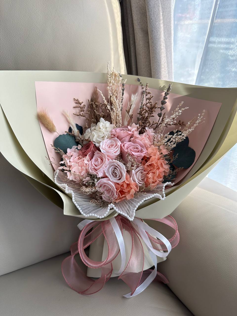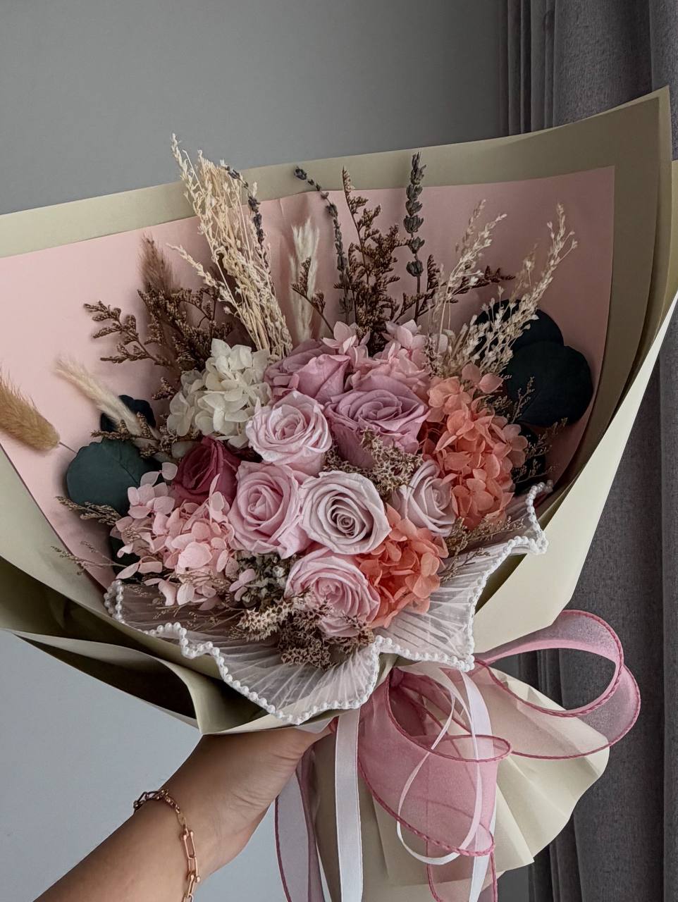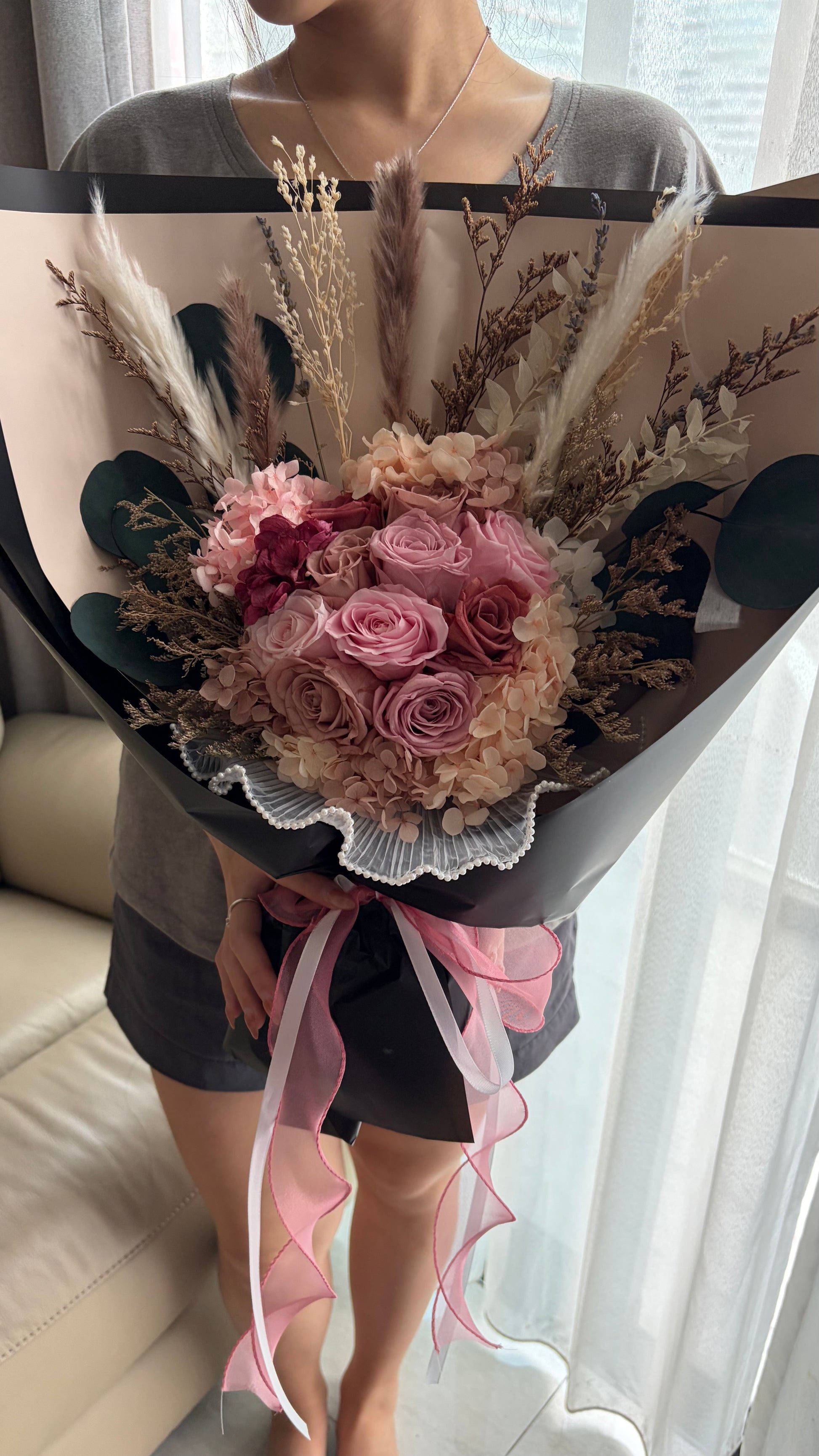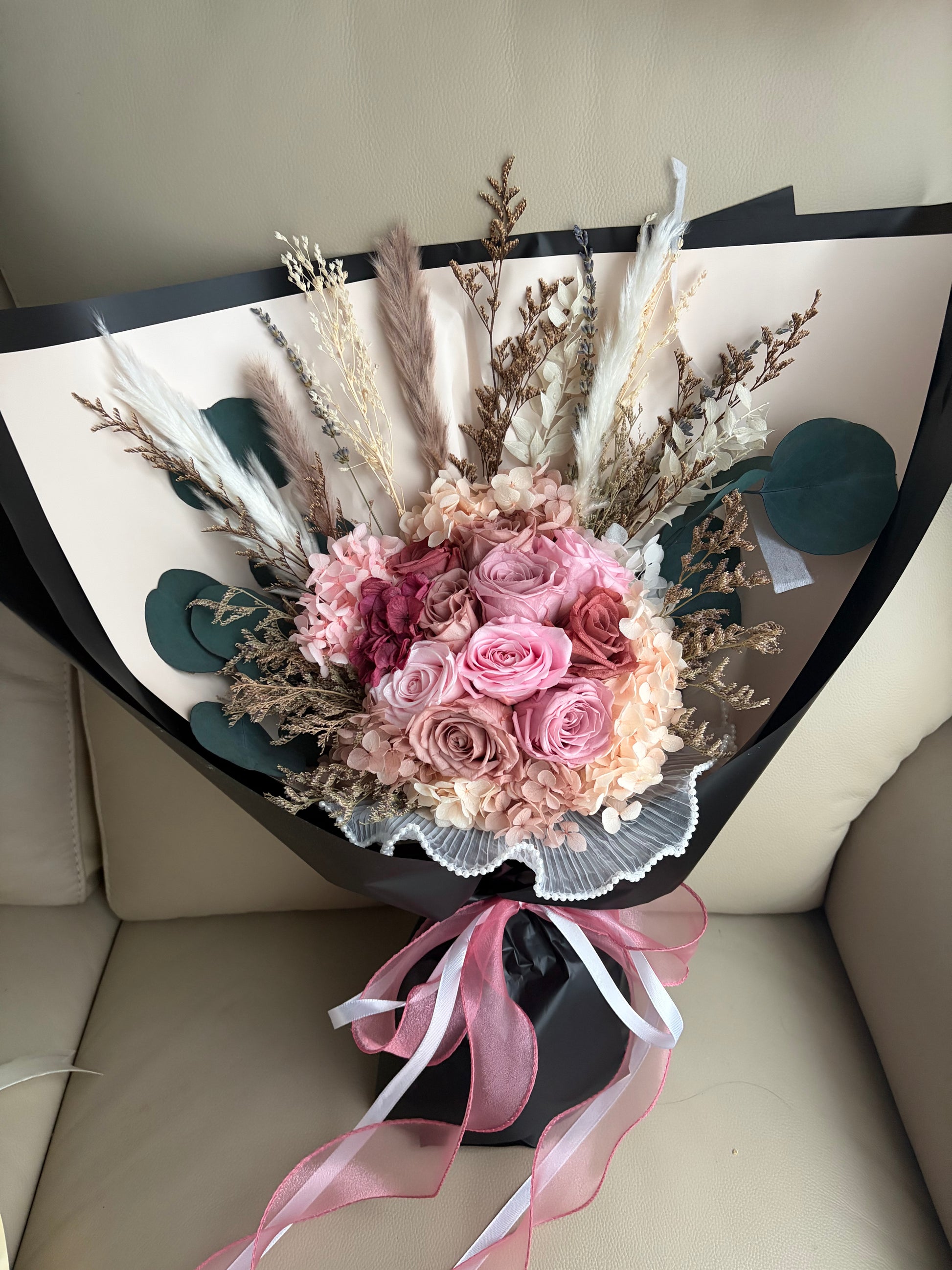 Discover the timeless charm of our Ariana Bouquet, an enchanting ensemble of blush-toned roses, coral hydrangeas, and delicate filler blooms. Accented with dried foliage and natural grasses, this bouquet harmoniously blends soft pastels with earthy textures. Its graceful arrangement evokes elegance and serenity, making it a captivating gift that lasts beyond fleeting moments.