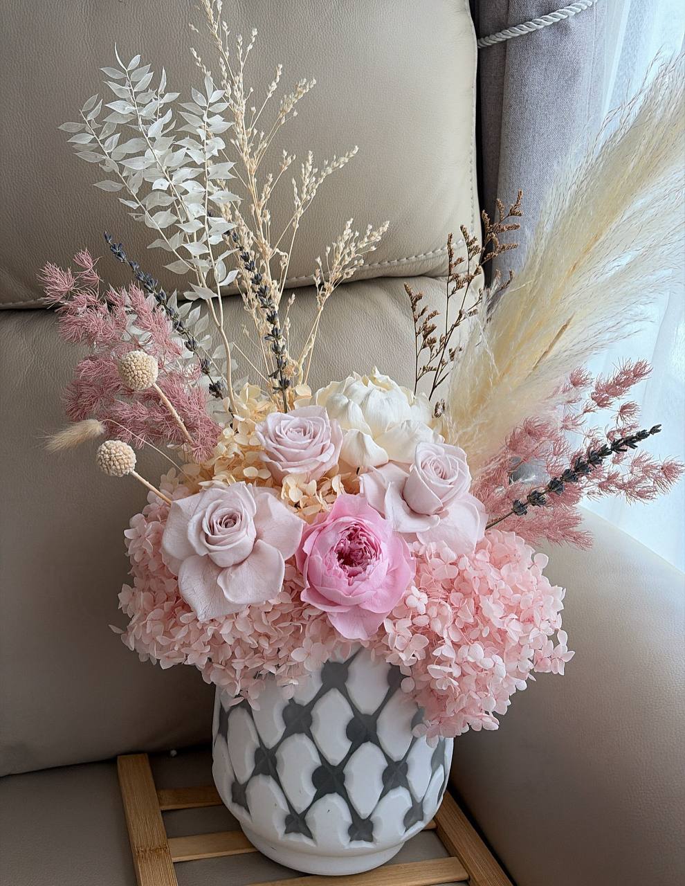 Delicate and graceful, this preserved arrangement pairs blush pinks with soft ivory tones for a romantic, uplifting presence. Featuring roses, hydrangeas, pampas, and airy dried accents in a patterned ceramic vase — it brings a touch of quiet elegance to any space.